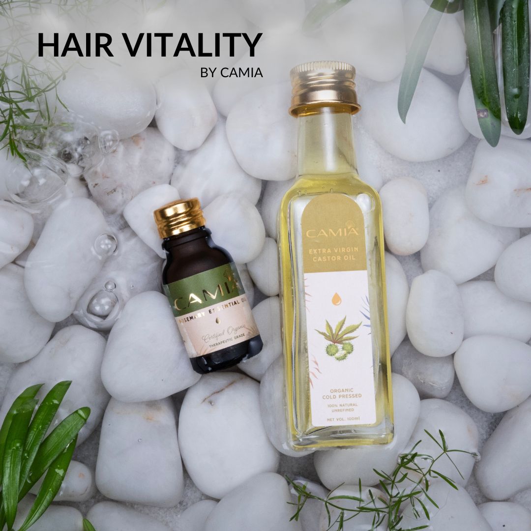Mix 15 ml of CAMIA Rosemary Essential Oil with 250 ml of CAMIA Cold-Pressed Castor Oil.
